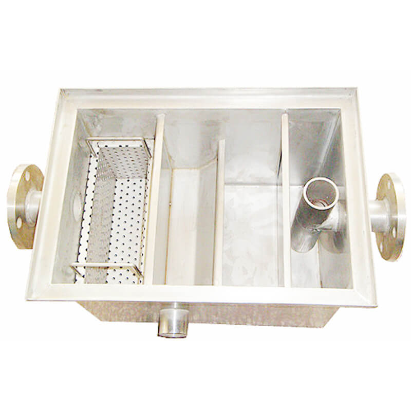 隔油池主要由两槽'三槽'四槽分别组成,当厨房排水流到第一槽时,杂物框将其中的固体杂物(菜叶等)截流除去,进入第二槽后,利用油水密度差使油水分离。废水沿第二槽隔油板向下流动,进入第三槽后从物理装置净化流出,再经出水管收集排出。第二槽中的油珠颗粒物沿隔油板集聚向上漂浮流动,始终浮在隔油池的第二槽内,经过隔油处理的废水则溢流入排水渠排出池外,进行后续处理,以去除乳化油及其他污染物。